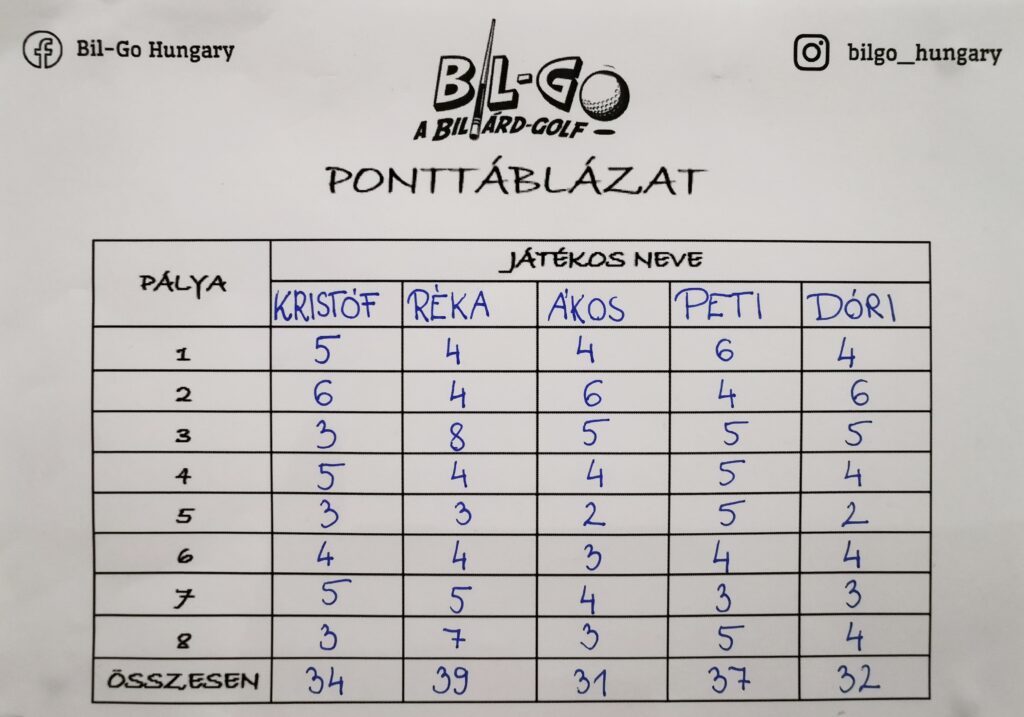 1. A játék célja, hogy minél kevesebb ütésből teljesítsük a pályákat, tehát betaláljunk a lyukba. Minden ütés egy pont. A pontokat felírjuk a ponttáblázatra.
